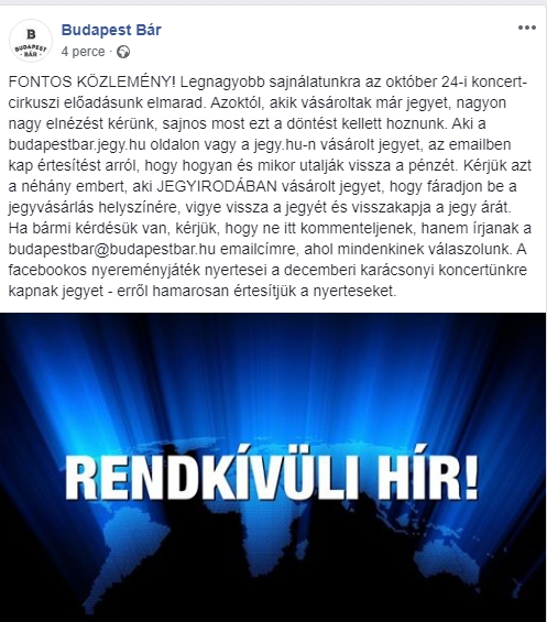 „FONTOS KÖZLEMÉNY! Legnagyobb sajnálatunkra az október 24-i koncert-cirkuszi előadásunk elmarad. Azoktól, akik vásároltak már jegyet, nagyon nagy elnézést kérünk, sajnos most ezt a döntést kellett hoznunk. Aki a budapestbar.jegy.hu oldalon vagy a jegy.hu-n vásárolt jegyet, az emailben kap értesítést arról, hogy hogyan és mikor utalják vissza a pénzét.”