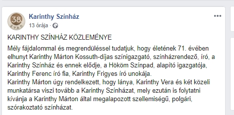 „Mély fájdalommal és megrendüléssel tudatjuk, hogy életének 71. évében elhunyt Karinthy Márton Kossuth-díjas színigazgató, színházrendező, író, a Karinthy Színház és ennek elődje, a Hököm Színpad, alapító igazgatója, Karinthy Ferenc író fia, Karinthy Frigyes író unokája.” – indul a szomorú közlés.