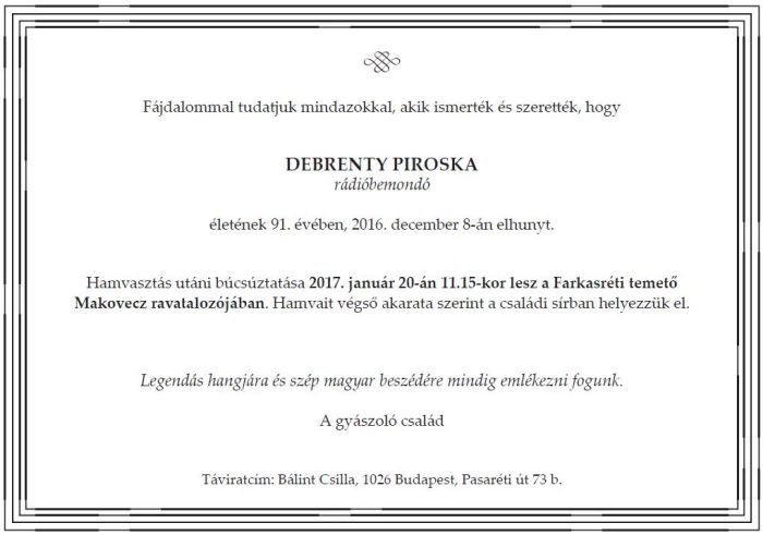 A rádiós temetése 2017. január 20-án 11.15-kor lesz a Farkasréti temetőben.