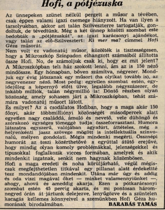 Barabás Tamás 1975-01-07-én megjelent Tükör című lapban írta meg gondolatait Hofi Géza egyik év végi műsoráról.