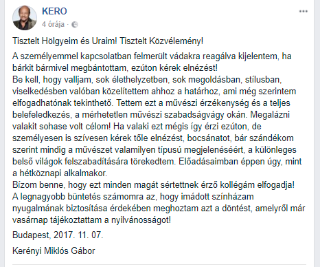 A legnagyobb büntetés számomra az, hogy imádott színházam nyugalmának biztosítása érdekében meghoztam azt a döntést, amelyről már vasárnap tájékoztattam a nyilvánosságot!Budapest, 2017. 11. 07.