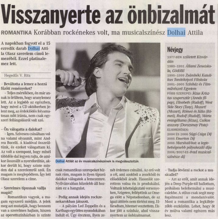 – Azt az erőt, amit annak idején a Deep Purple-től hallottam, próbálom beleformálni a musicalekbe. A stílus csak segít megfogalmazni  a  mondanivalót. Most a romantika a legkifejezőbb eszközöm. Lehet, hogy öt év múlva valami egészen más lesz.