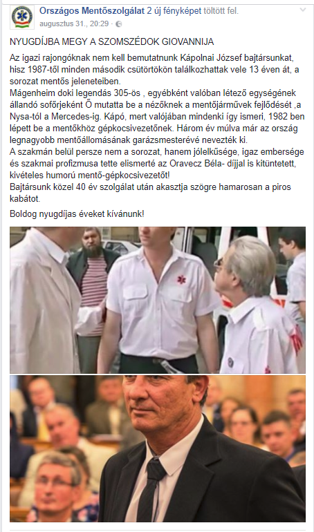 A szakmán belül persze nem a sorozat, hanem jólelkűsége, igaz embersége és szakmai profizmusa tette elismerté az Oravecz Béla- díjjal is kitüntetett, kivételes humorú mentő-gépkocsivezetőt!