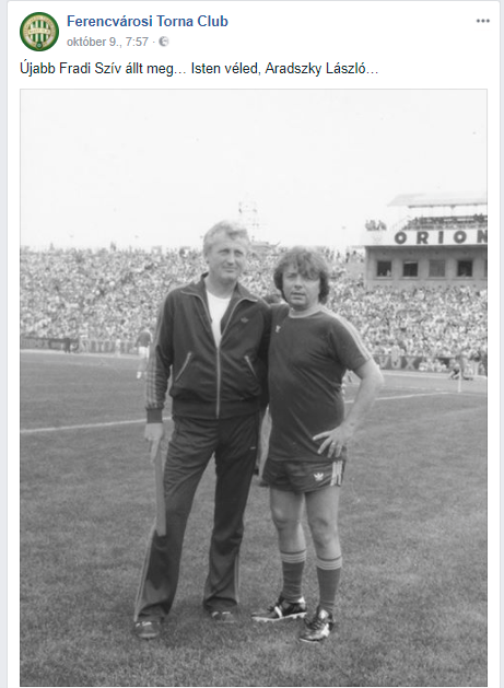 Újabb Fradi Szív állt meg… Isten véled, Aradszky László… – áll a Ferencvárosi Torna Club október 9-ei bejegyzésében, ami a klub hivatalos oldlaán jelent meg.