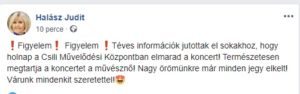 „Figyelem! Figyelem! Téves információk jutottak el sokakhoz, hogy holnap a Csili Művelődési Központban elmarad a koncert! Természetesen megtartja a koncertet a művésznő! Nagy örömünkre már minden jegy elkelt! Várunk mindenkit szeretettel!„ – közölték az énekesnő-színésznő hivatalos oldalán.