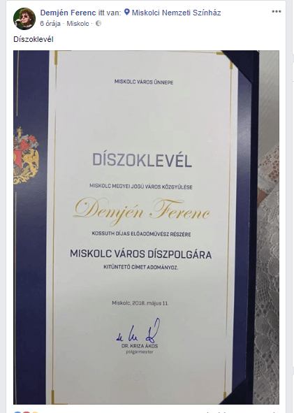 Nagy megtiszteltetés érte Demjén Ferenc énekest május 11-én, ugyanis Miskolc városa ünnepélyes keretek között adta át neki a díszpolgári címet.