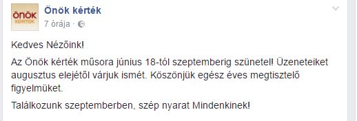Az Önök kérték műsora június 18-tól szeptemberig szünetel! Üzeneteiket augusztus elejétől várjuk ismét. Köszönjük egész éves megtisztelő figyelmüket. Találkozunk szeptemberben, szép nyarat Mindenkinek!” – áll a közleményben.